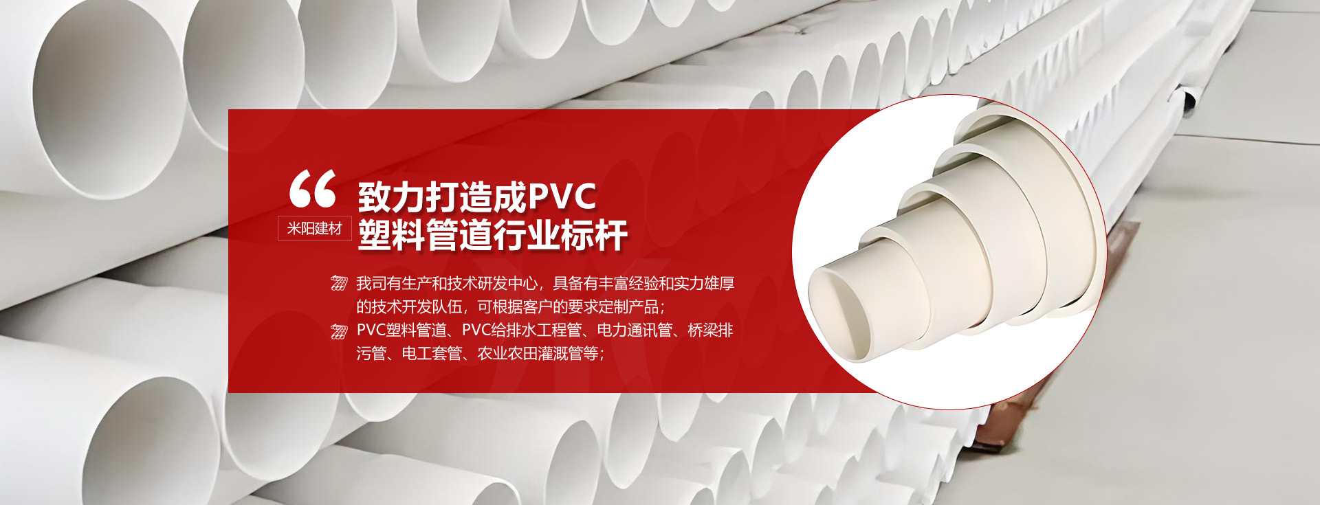 PVC系列管道一站式采購(gòu)基地 米陽(yáng)建材多年的品質(zhì)追求 值得您信賴的品牌One stop procurement base